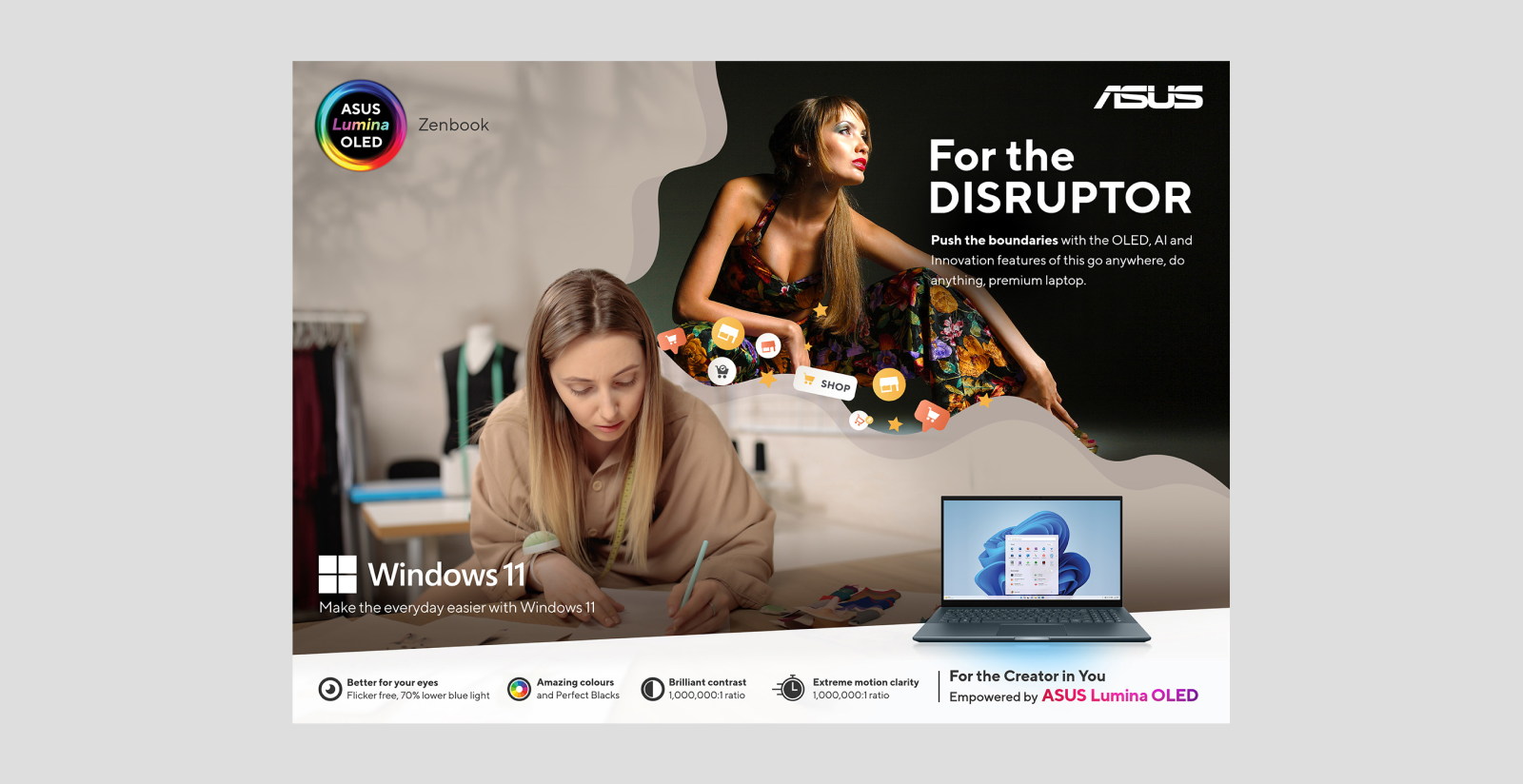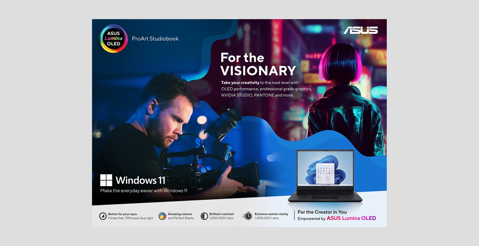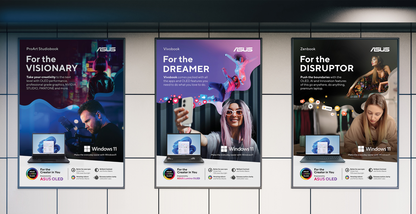 Working with the ASUS team, we identified that their target audiences are effectively ‘creators.’ Whether you are a professional photographer, developing a start-up business idea, or creating content for TikTok, we wanted to strengthen the ‘OLED for everyone’ message by showcasing how you can use ASUS Studiobook, Zenbook, and Vivobook laptops, powered by OLED, to power your creativity.