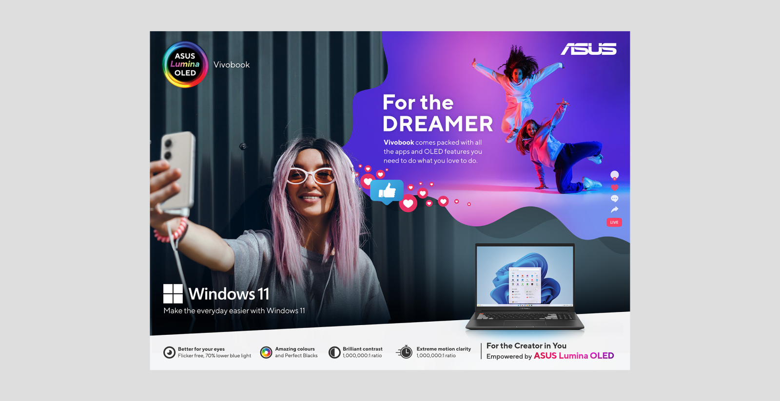 We developed a campaign that showcased how ASUS laptops with OLED empowered creators to achieve whatever they want. The message ‘For the Creator in You.’ aimed to demonstrate that whatever drives you, there is an ASUS OLED laptop that can help you reach your goals. The statement aims to empower and hero ASUS customers and celebrate what makes us all creators in whatever we pursue.