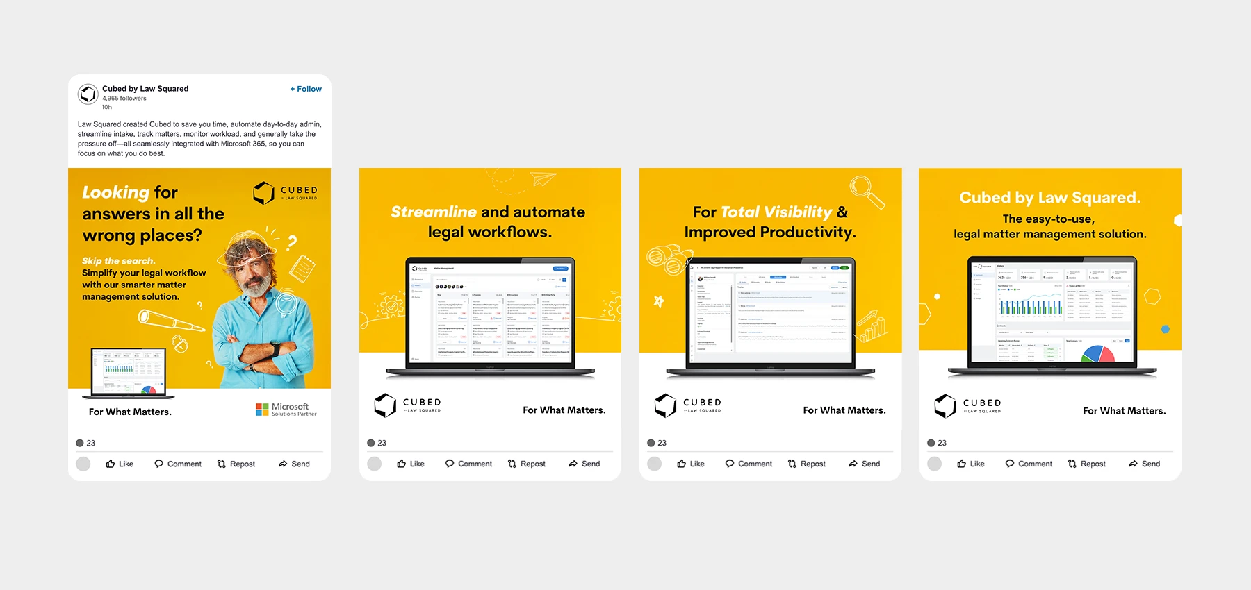 Create a cost-effective launch campaign to build awareness of Cubed, a legal matter management tool by Law Squared. The goal: highlight its benefits, connect with busy in-house legal teams, and drive demo inquiries.