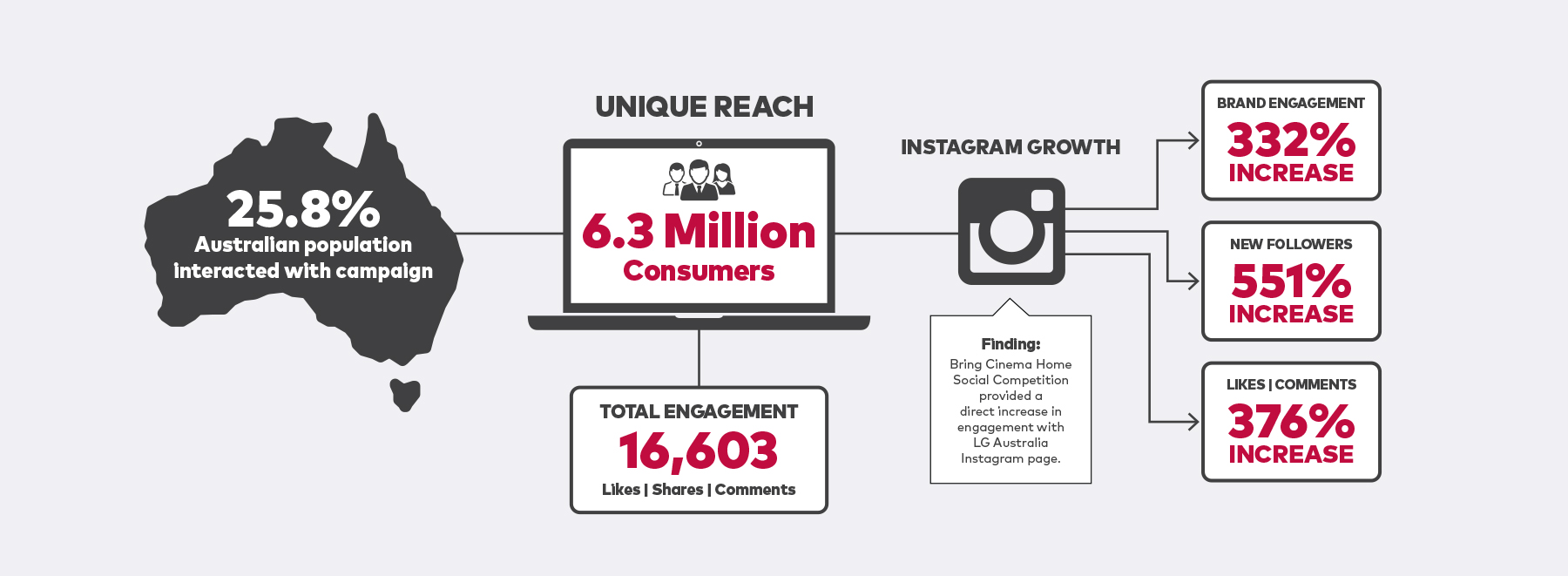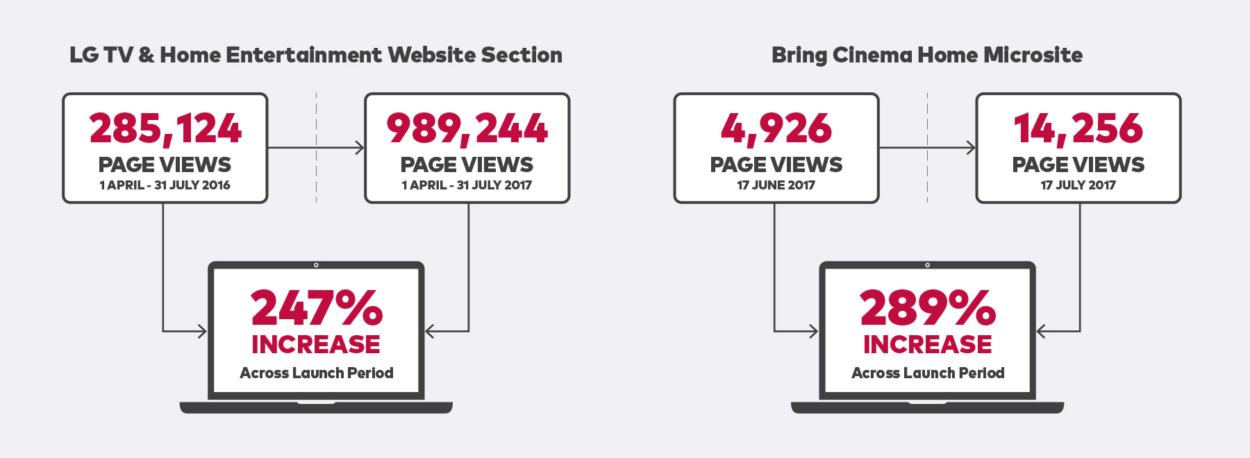 The competition promotion we launched also provoked a sharp rise in likes, shares and comments with LG’s Instagram page experiencing a staggering 551% increase in followers. By the end of July LG’s Home Entertainment website saw a 247% increase in hits while the dedicated campaign microsite achieved a 289% increase.