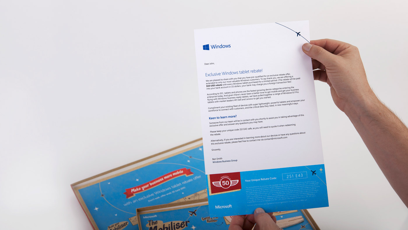 Microsoft wanted to reach their existing time-poor enterprise customers and communicate the business benefits of Windows Pro tablets and how they could help productivity. As an incentive, Microsoft offered enterprise customers a US$50 rebate towards the purchase of any approved Windows 8 Pro or 8.1 Pro tablets. Against a tight budget Microsoft wanted a solution with more impact than a DL flyer.