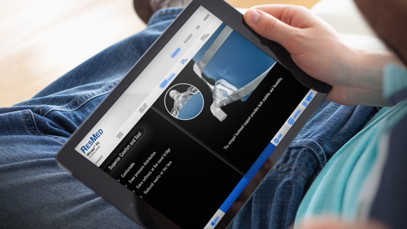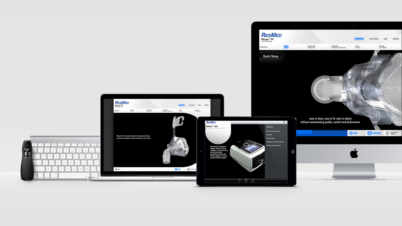 ResMed required a more consistent and dynamic way of selling their products. Traditionally, each sales rep used their own collateral and a created their own PowerPoint presentation. This resulted in unprofessional looking material and inconsistent messaging across the sales team. As sales reps all have different selling methods, a single uniform set of slides simply would not work for everyone.